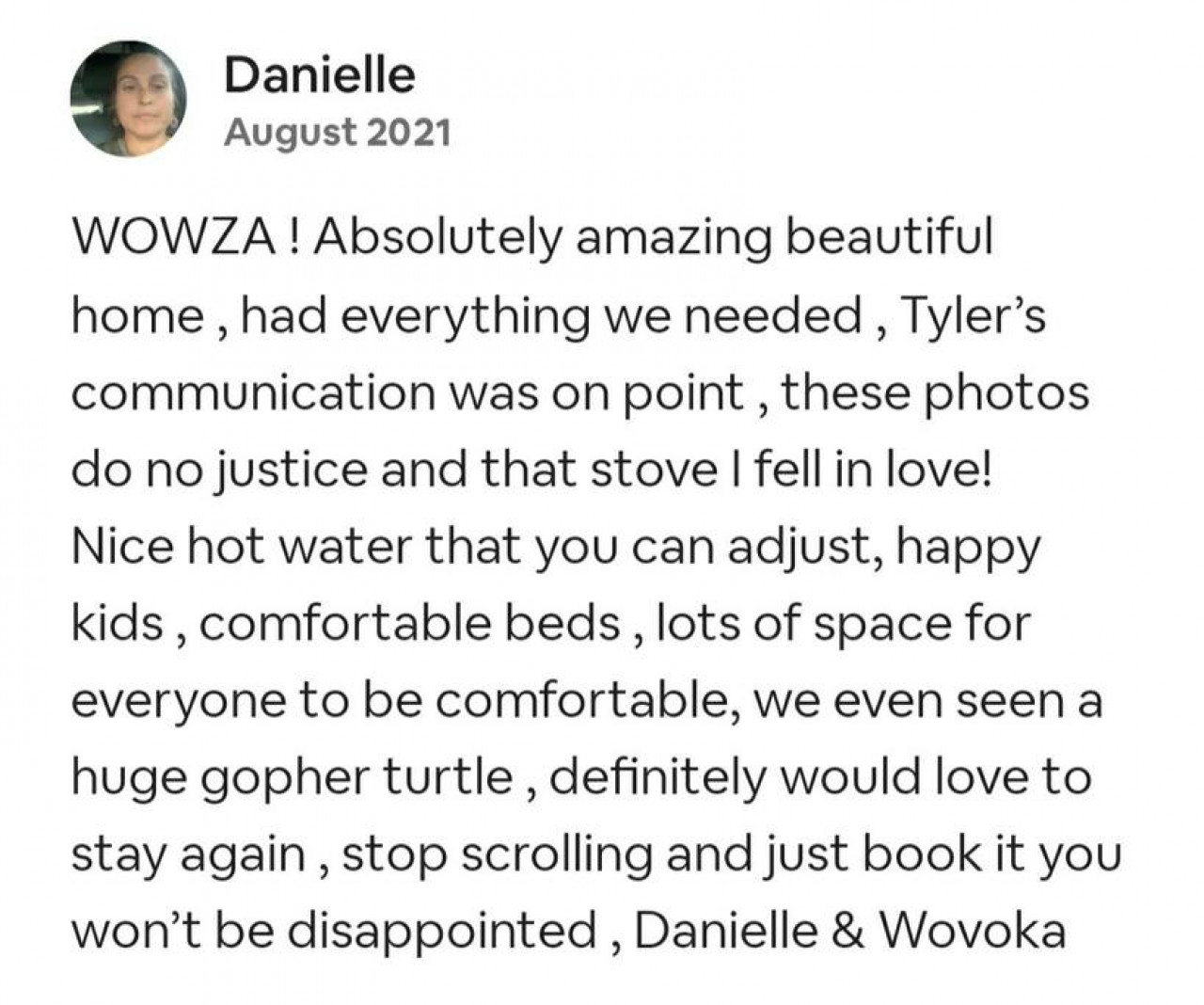 November 2025 4.00My family and I enjoyed our stay at this cabin home. It was far enough away from Homosassa to feel like we were far out in the country. We loved sitting out on the back porch and enjoying the area. The wrap around porch was really nice.