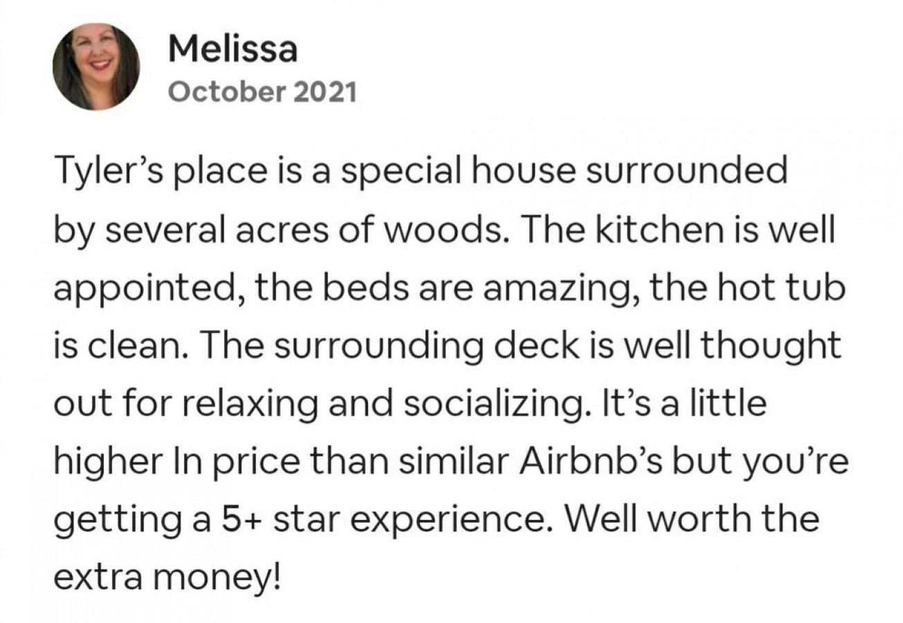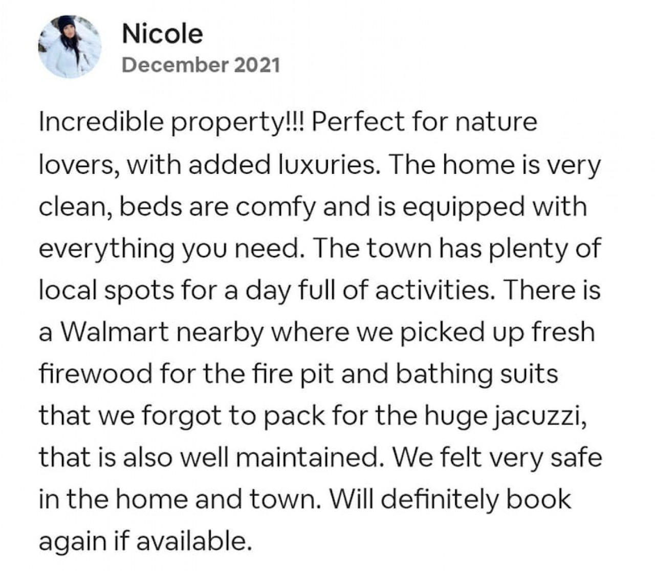 June 2025 5.00We had such a great stay! The cabin was exactly as described—clean, cozy, and full of thoughtful touches. Tyler was incredibly proactive and communicative throughout, making everything super smooth from check-in to check-out. We especially appreciated the hot tub and s’mores supplies. Would absolutely stay here again and highly recommend to anyone visiting the area!